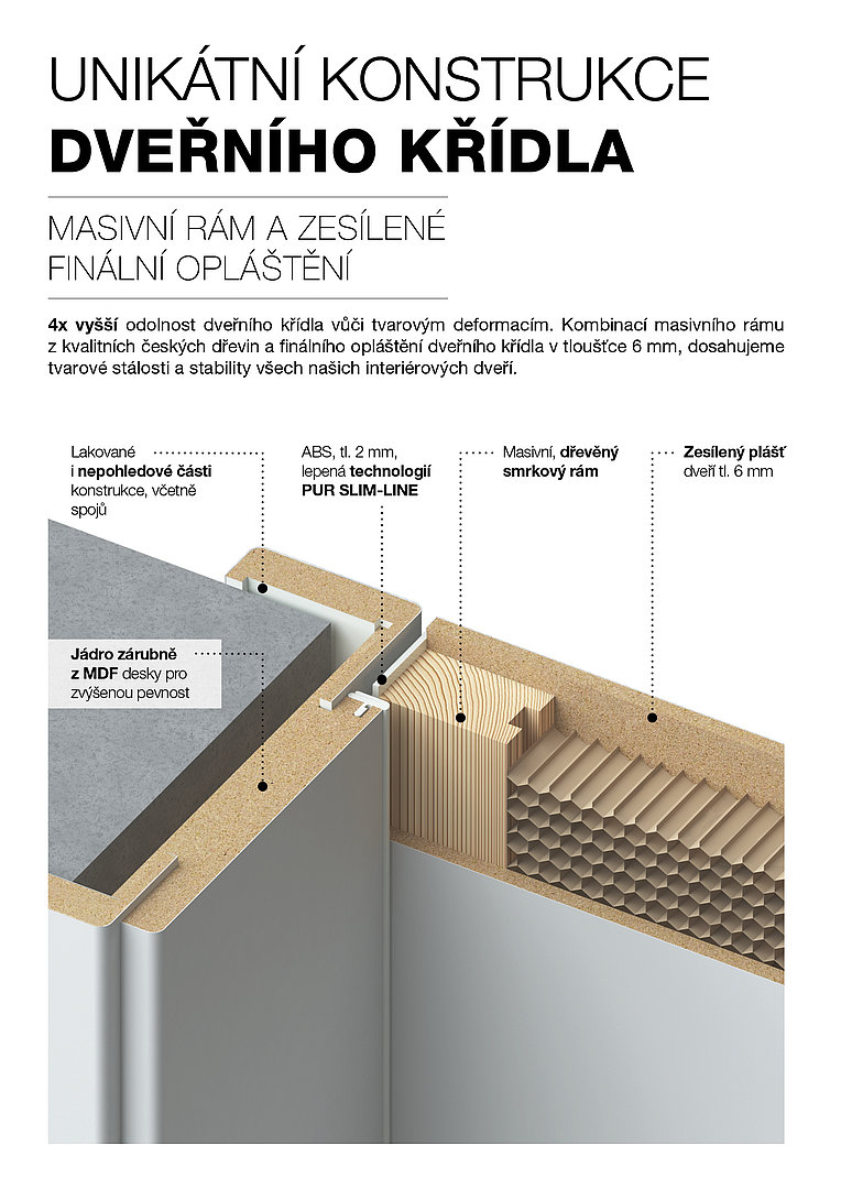 Kliky jsou designově sladěny s dveřním křídlem a zámkem. Tyto dveře nabízíme také ve variantě s prosklením.