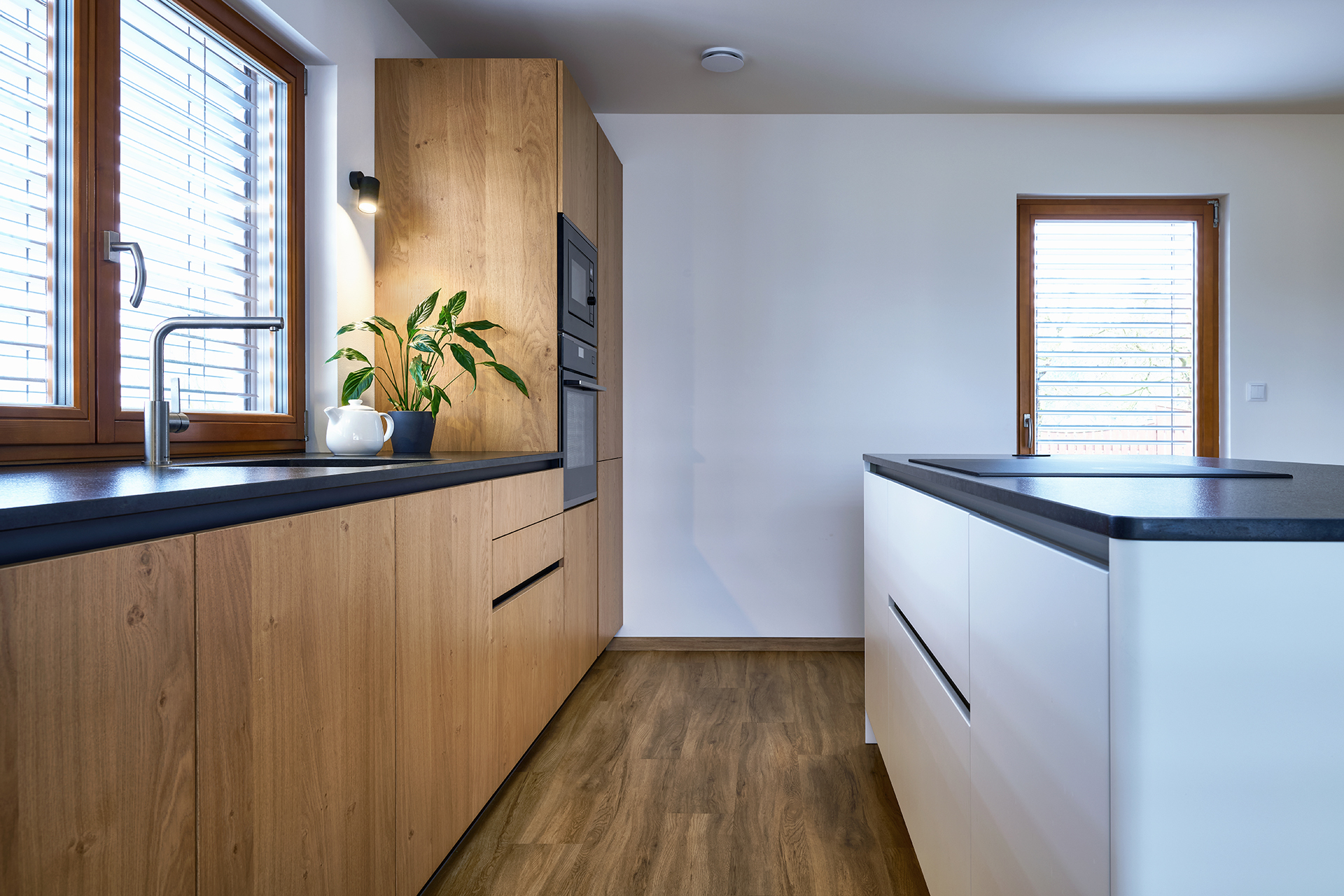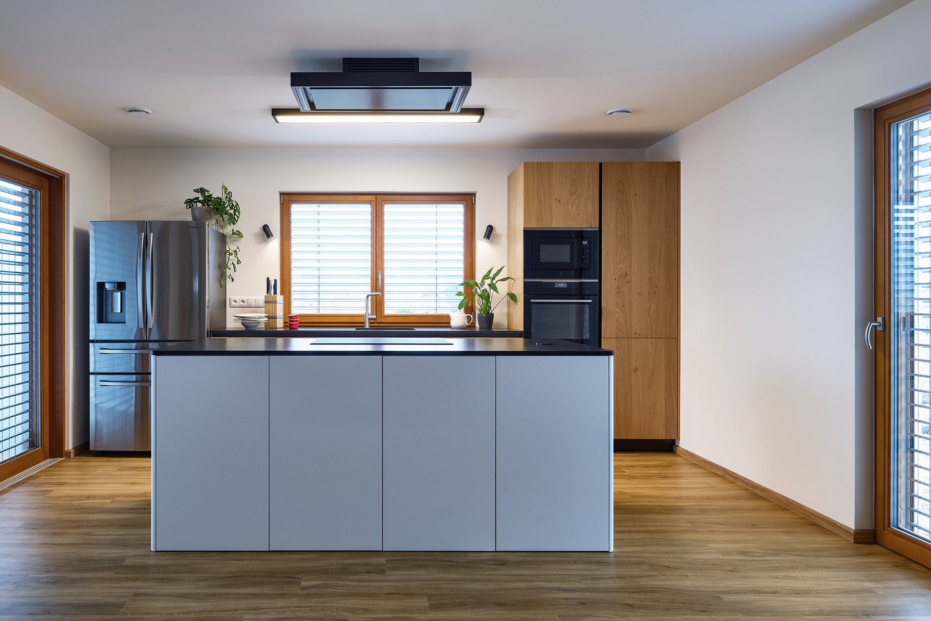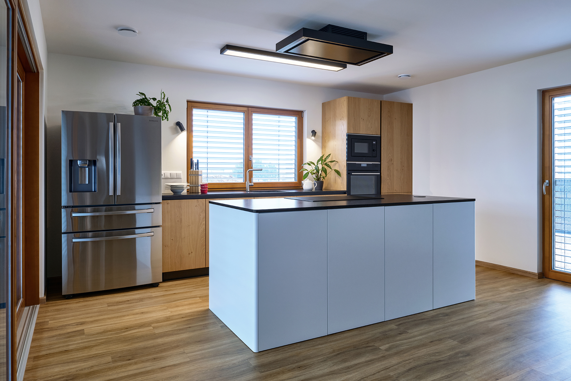 Vestavné spotřebiče jsou integrovány do vysoké dýhované sestavy, díky čemuž celek působí kompaktně a architektonicky sjednoceně. Otevřenost, dostatek denního světla i přímá návaznost na exteriér podtrhují vzdušný a klidný charakter této realizace.