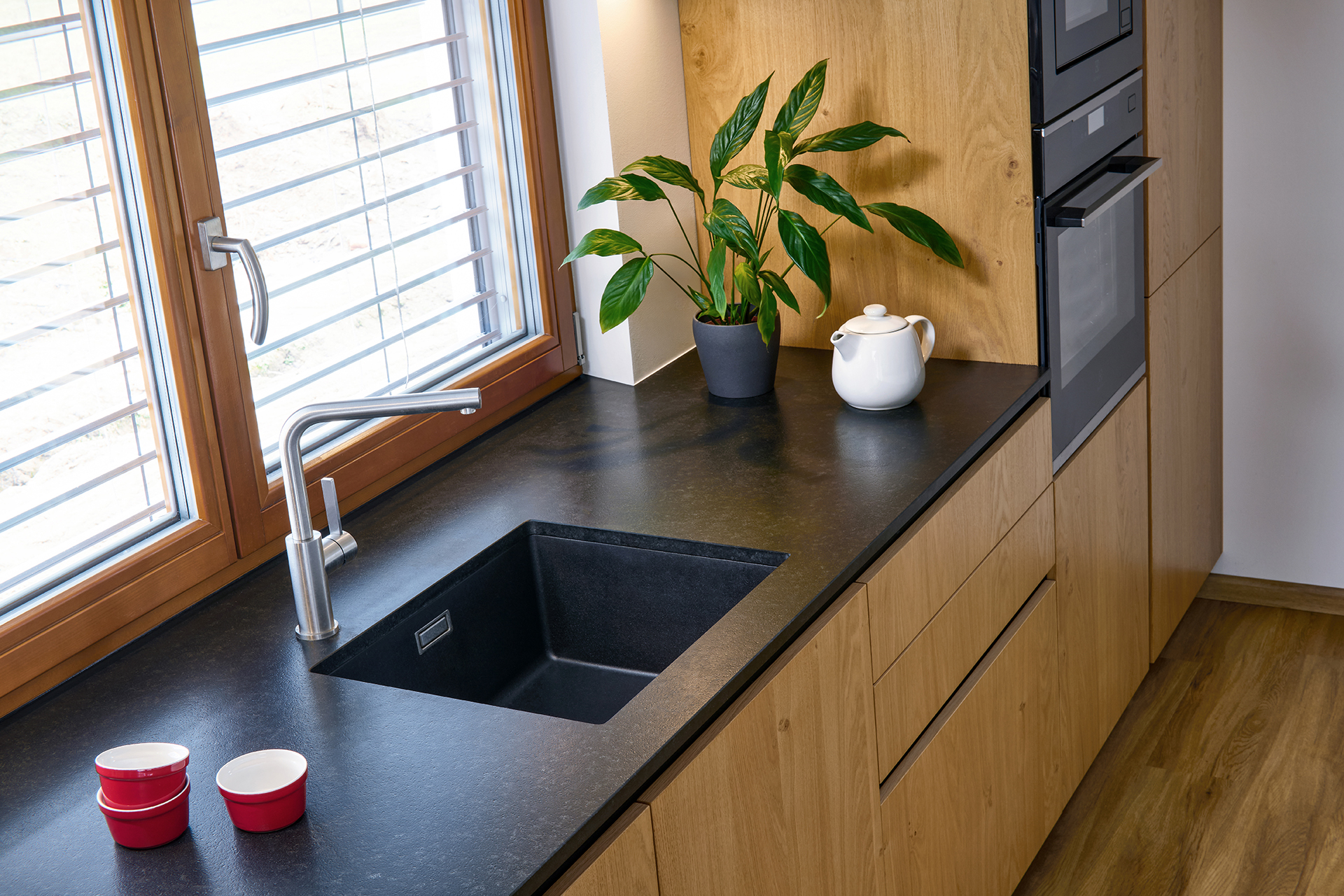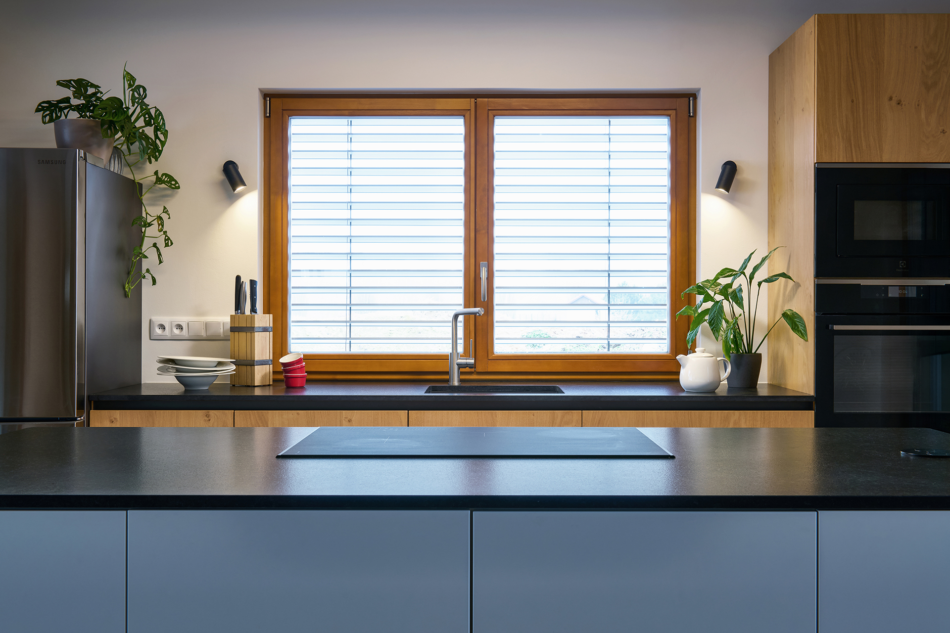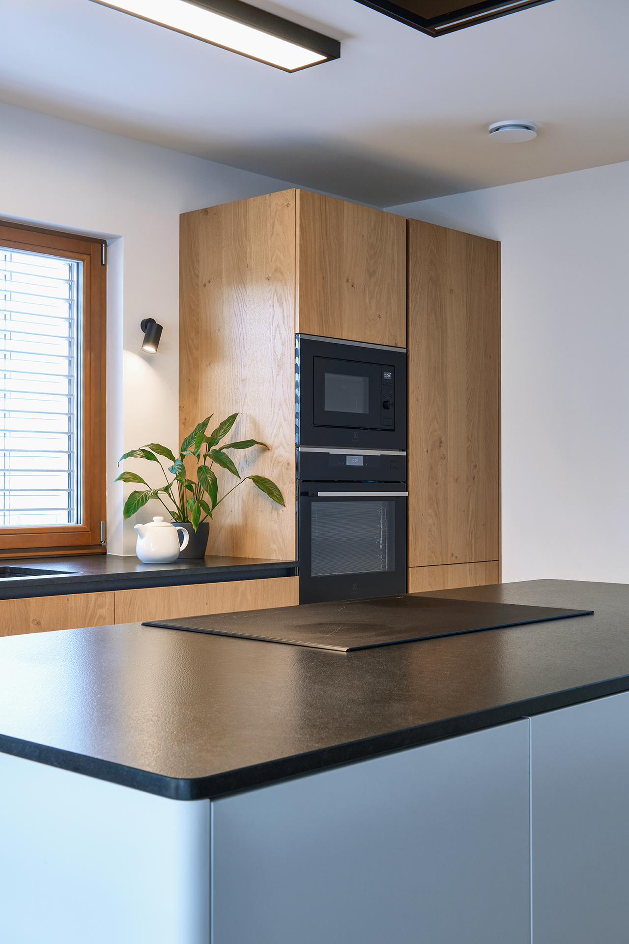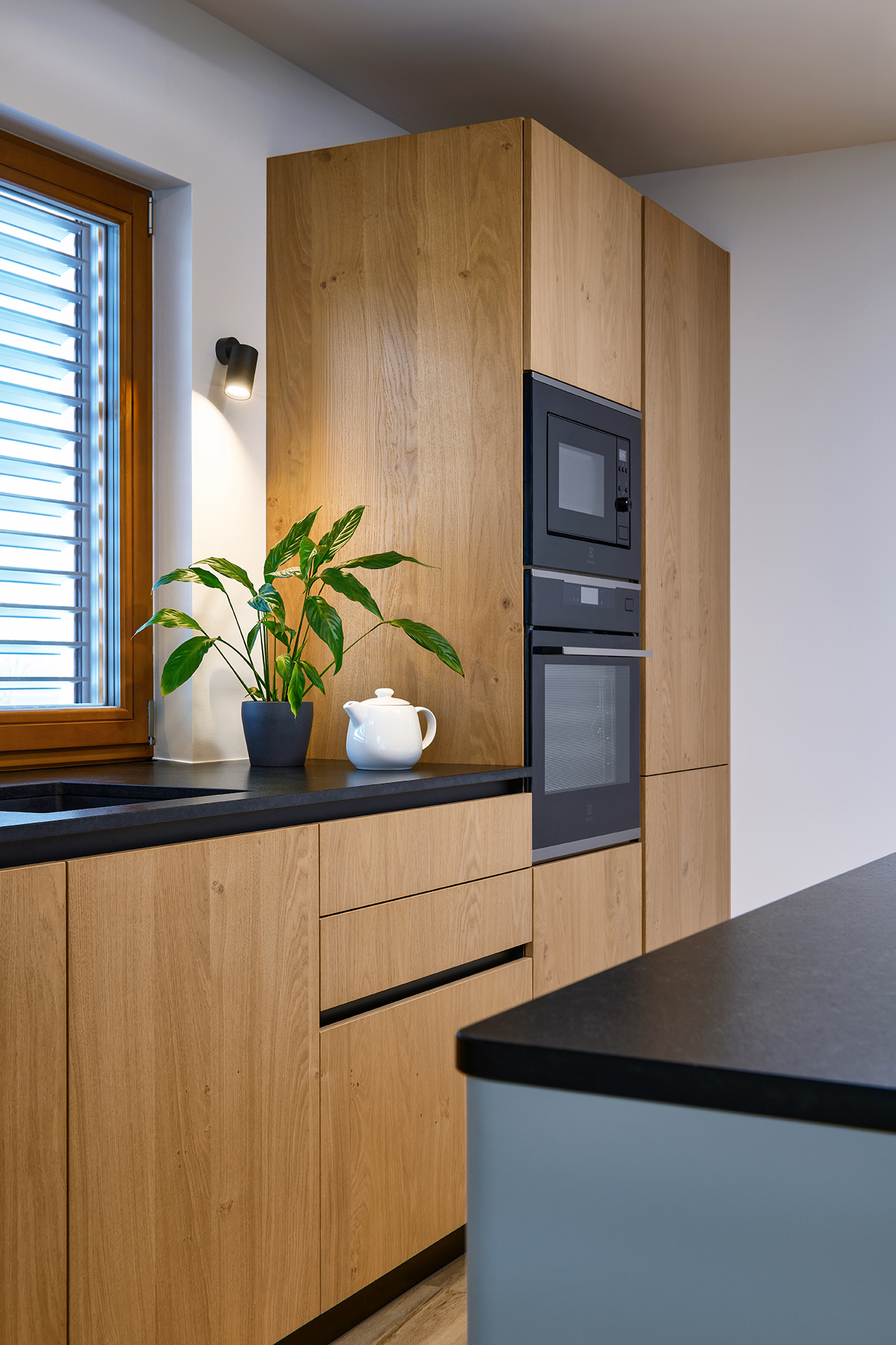 Vestavné spotřebiče jsou integrovány do vysoké dýhované sestavy, díky čemuž celek působí kompaktně a architektonicky sjednoceně. Otevřenost, dostatek denního světla i přímá návaznost na exteriér podtrhují vzdušný a klidný charakter této realizace.