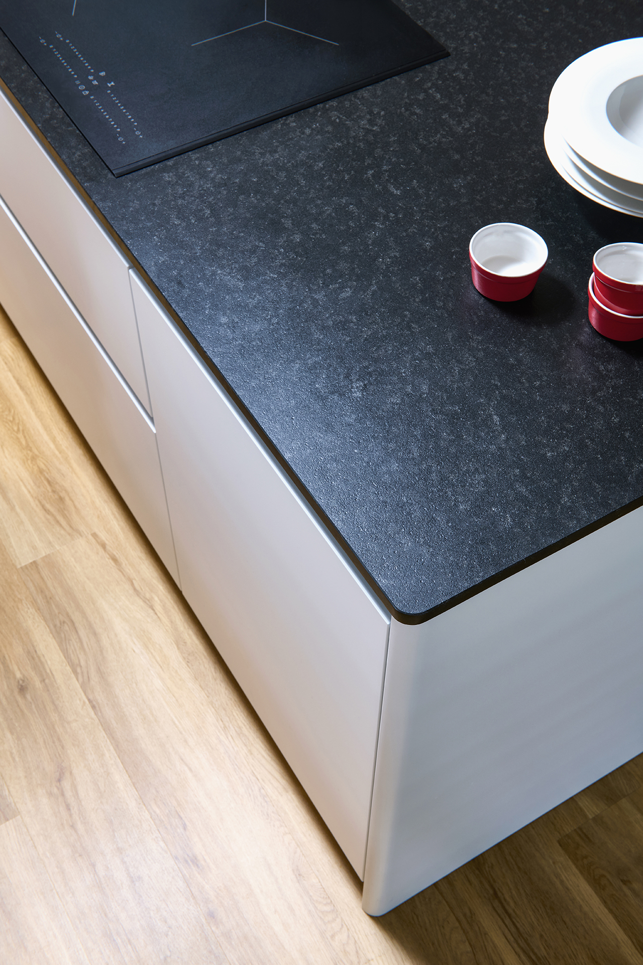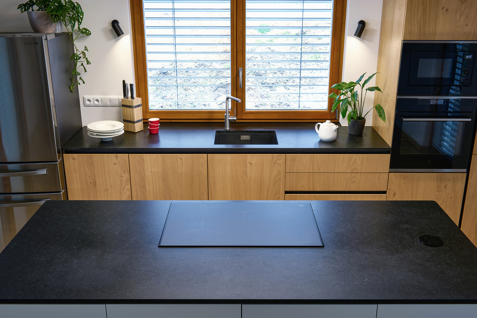 Dominantou prostoru je velkorysý ostrůvek se zaoblenými hranami, které zjemňují jeho siluetu, opticky ji odlehčují a zvyšují komfort při každodenním používání. Pracovní deska z přírodního kamene Nero Zimbabwe v matné úpravě vytváří výraznou horizontální linii a citlivě propojuje jednotlivé části interiéru.